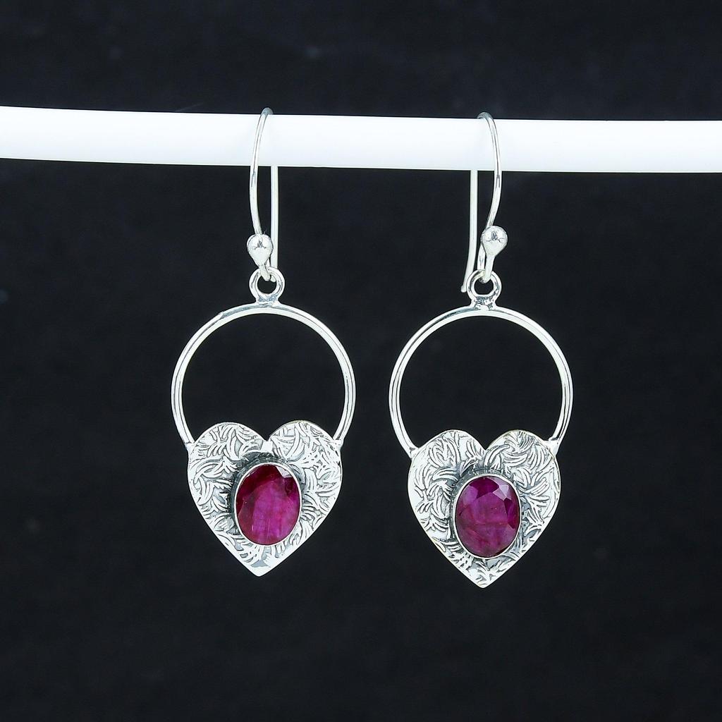 Dainty Kashmir Ruby Gemstone Heart Shape Earrings, 925 Sterling Silver Earring, Handmade Boho Silver Jewelry Dangle Earrings, Wadding Gift