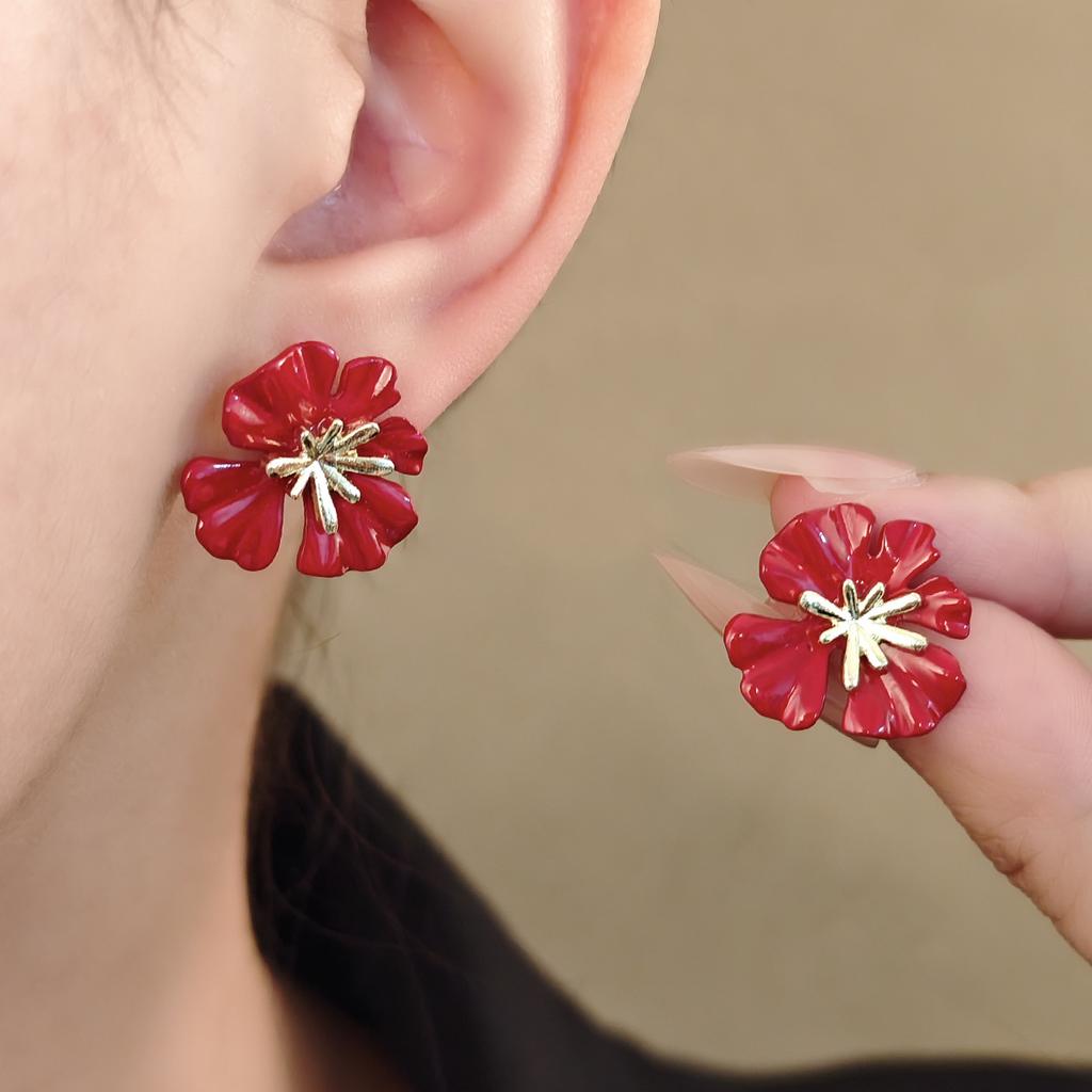 Elegant Red Flower Earrings in French Vintage Style with a Simple Design - Minimalist and Elegant Women's Ear Jewelry