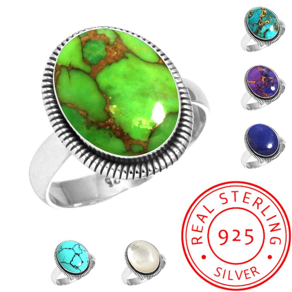 925 Sterling Silver Ring Women Gemstone Handmade Jewelry Halloween Gift Blue Green Purple Copper Turquoise Pearl Lapis Mother Of Pearl Costume