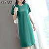 VEZFAA Women's Fashion Summer Spring Solid Color Print Short Sleeve O-Neck High Waist Casual Dresses