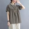 This stylish shirt is designed for comfort and elegance, featuring a charming striped pattern and crafted from a premium blend of cotton and linen. The shirt showcases a slimming fit and includes eye-catching patchwork and quilted decorations, adding a unique touch to its design. The distinctive Peter Pan collar enhances its classic appeal, while the short sleeves make it perfect for warm weather. This versatile piece seamlessly combines timeless style with contemporary details, making it a must-have addition to any summer wardrobe.