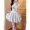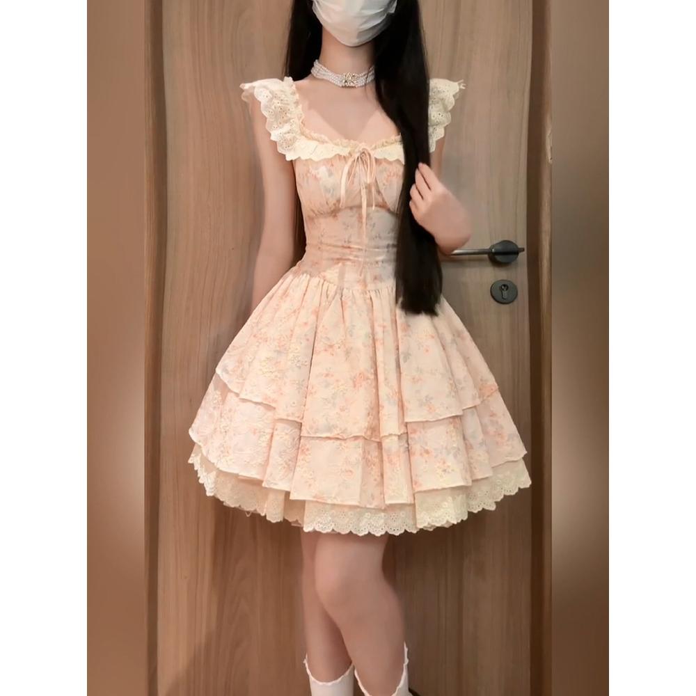 Cute sweet girl pink floral dress female design feeling waist thin short skirt summer new lace