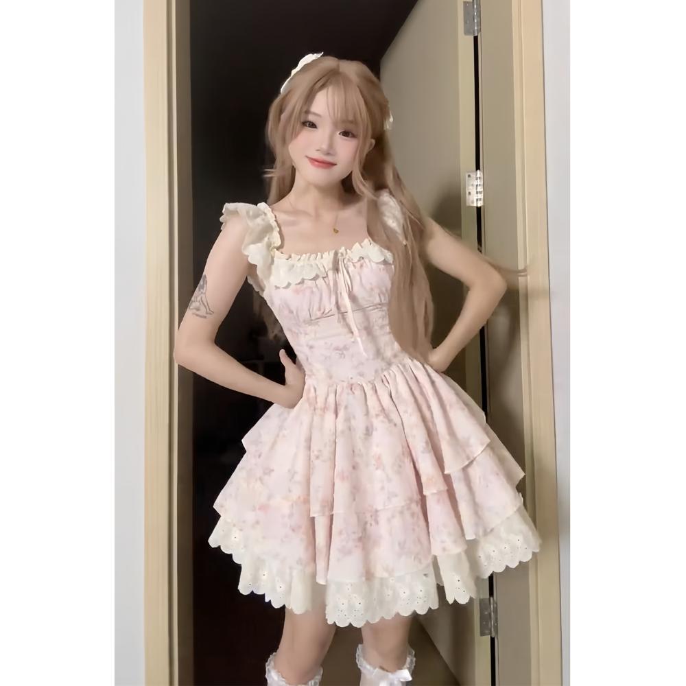 Sweet little flying sleeve floral dress for women, summer small man, first love princess cake dress, waist fluffy short dress for women