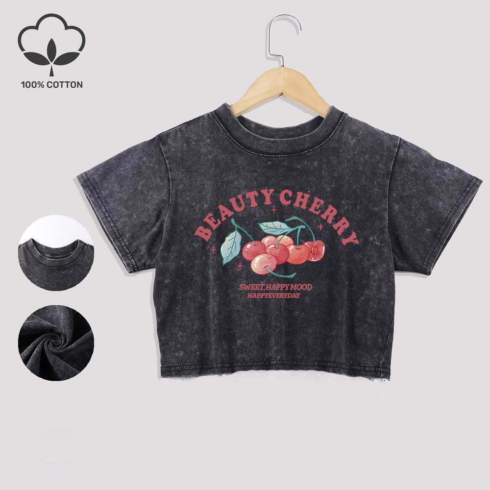 Beauty Cherry Art Letter Prints Cotton Crop Tops Trend Summer Lace Hem Washed T-Shirts Regular Fit O-Neck Tees Casual Clothes