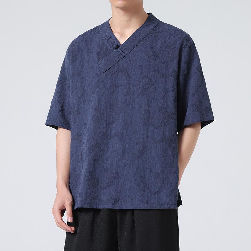 2024 Men's Summer Cotton Linen Short Sleeve T-Shirt with Frog Button – Plus Size Chinese Style Hanfu