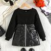 Autumn Girls' Two-color Mesh Embroidered Long Sleeved Top, PU Leather Skirt, Children's Set