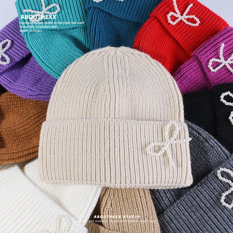 Pearl Bow Autumn and Winter Warm Woolen Hat for Women Korean Knitted Hat Showing Face Small Versatile Couple Pullover Cold Hat