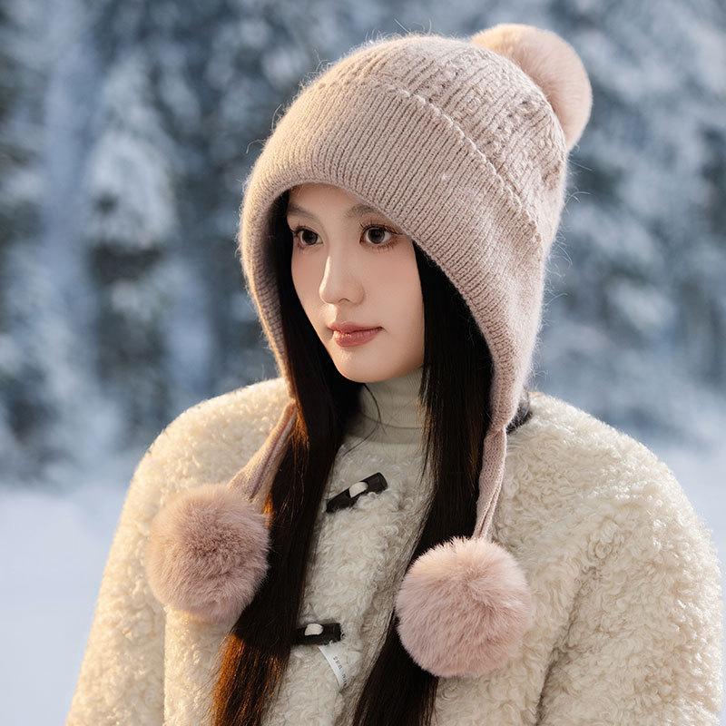 New Rabbit Fur Knitted Warm Hat Autumn and Winter Fleece Thickened Ear Protection Face Fleece Fleece Hat Women's Cold Protection Hat