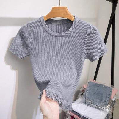 Letné ležérne pletené dámske tričko s krátkym rukávom módne krátke dámske topy s výstrihom do O Oblečenie v kórejskom štýle so strapcami 28359