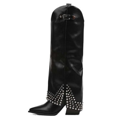 Fashion New Rivet Belt Buckle Decorative Wedge Heel Skirt Boots European American Fashion Pointed Black Thick Heel Pants Boots Size34-43