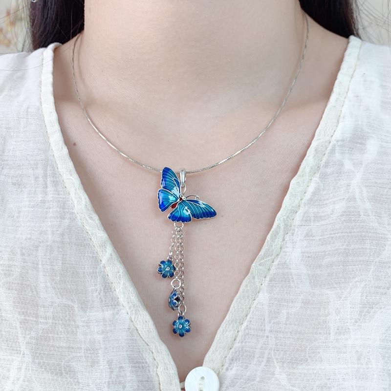 925 Sterling Silver Enamel Craft Butterfly Flower Fringed Pendant Retro Ethnic Style Collarbone Chain Blue Butterfly Pendant