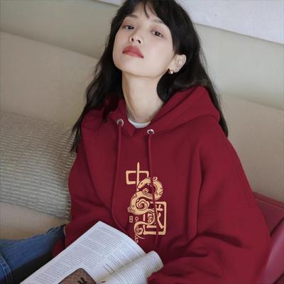 Červená sviatočná novoročná mikina voľná ležérna bunda s kapucňou dámska národný štýl trendy dizajn jeseň a zima nová mikina