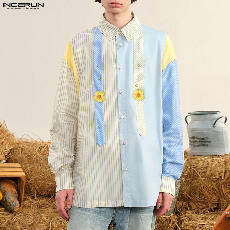 INCERUN Oversized Men Lapel Neck Long Sleeve Striped 3D Flowers Casual Loose Shirts