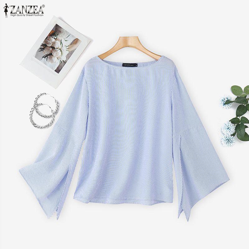 ZANZEA Women Stripe Print Casual Round Neck Long Sleeve Blouse