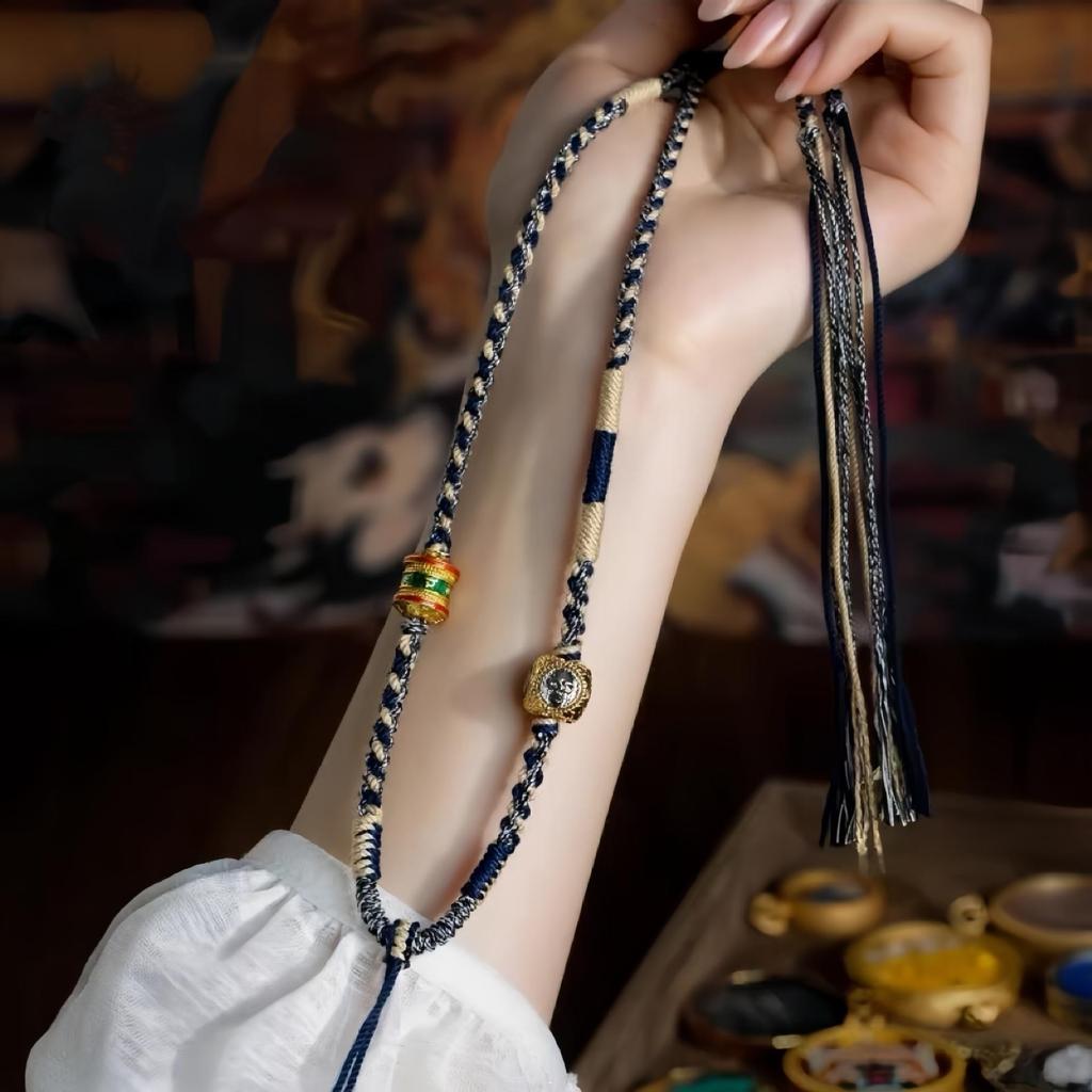 Tibetan Style Woven Thangka Pendant Necklace with Buddha Amulet and Six-Syllable Mantra.