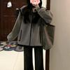 Women's Gray Patchwork Wool Coat with Stand-Up Collar - College Style Cardigan