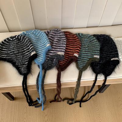Retro kórejský štýl pruhovaná pletená čiapka s ušami z mohéru pre ženy - Roztomilá a teplá na jeseň/zimu