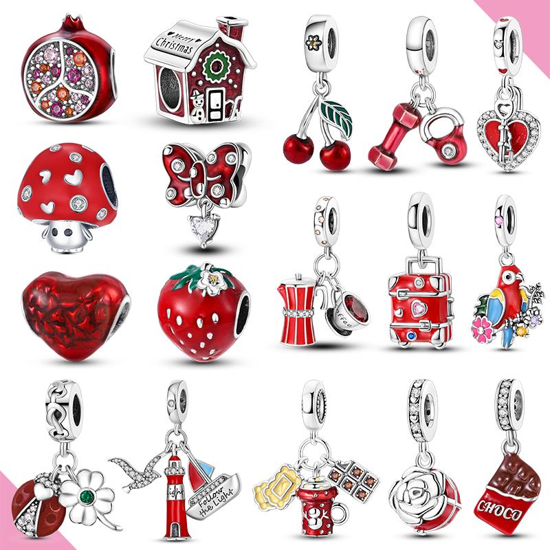 Red Series Copper Pendant Charm Strawberry Heart Coffee Fit Original Bracelet Gifts Woman Jewelry
