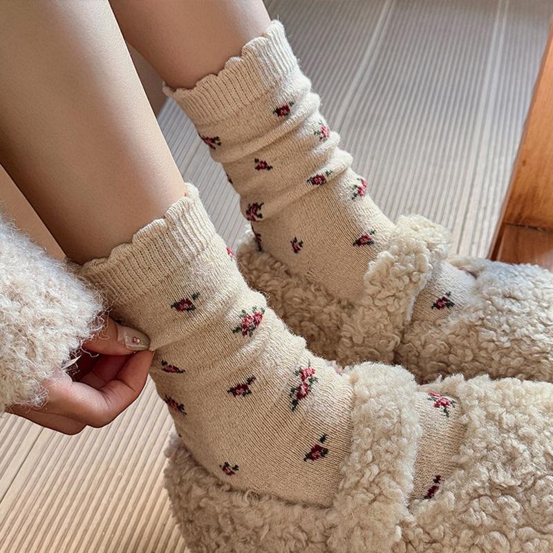 Women's Socks Winter Thicken New Retro Fashion Korean Style Warm Socks Casual Novelties Sweet Long Ladies Flower Socks Comfort
