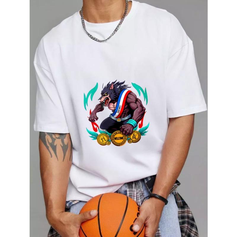 White T Shirt Wolf Mascot with Medals and Welcome Text Casual Wear for Men