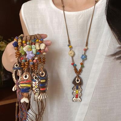 Vintage Ethnic Style Necklace Tassel Long Sweater Chain Retro Ceramic Fish Necklace Decoration
