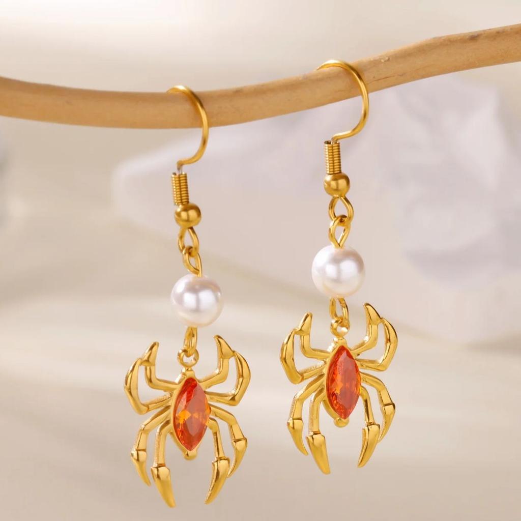 Zircon Pearl Spider Earrings For Women Gold Color Stainless Steel Spider Dangle Drops Trendy Minimalist Jewelry Gift