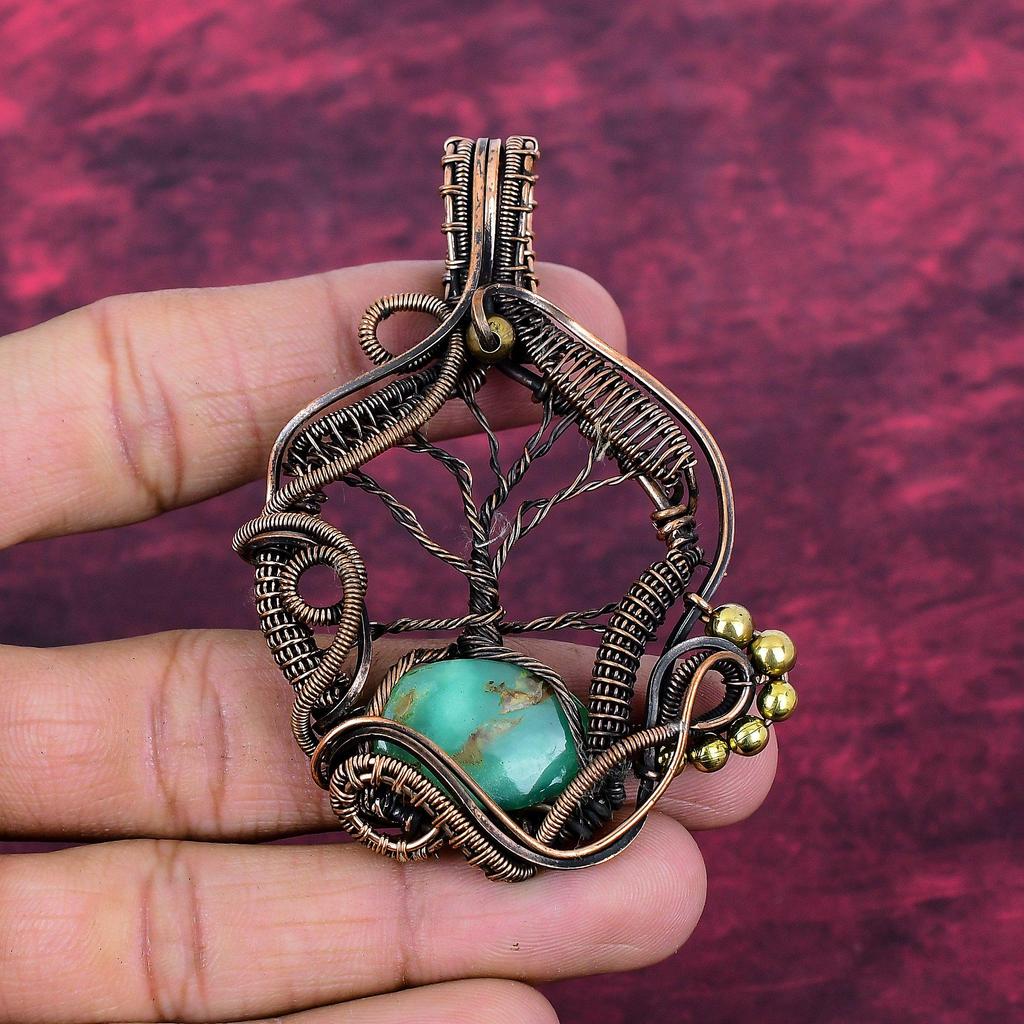 Tree Of Life Chrysoprase Gemstone Pendant Copper Wire Wrapped Handmade Jewelry
