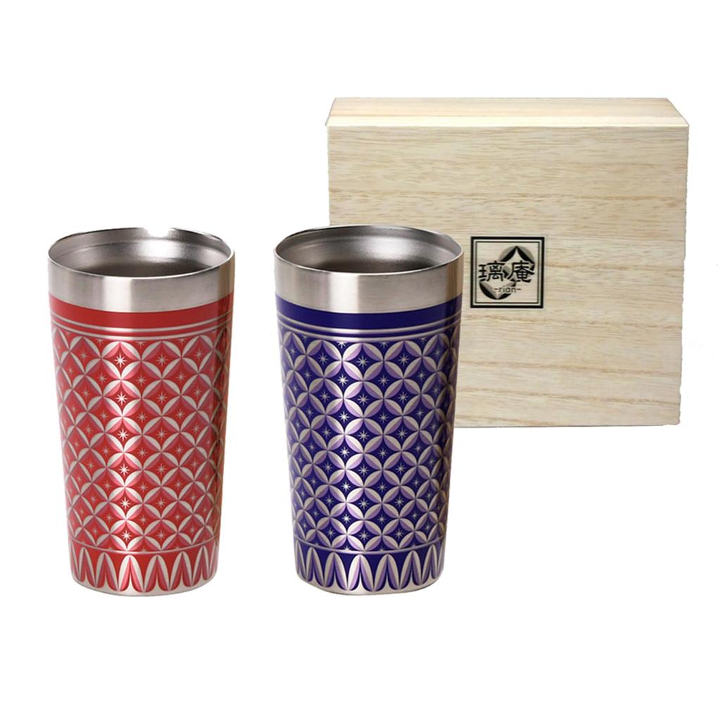 Pair of Ri-an stainless steel tumblers, vacuum-sealed, approximately 350ml, red and blue, in a wooden box. RA-7007A.