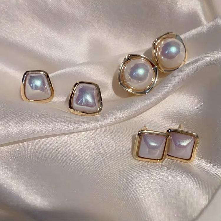 Temperament Gold Color Edging Geometric Imitation Pearl Stud Earrings for Women Retro Piercing Jewelry Accessories