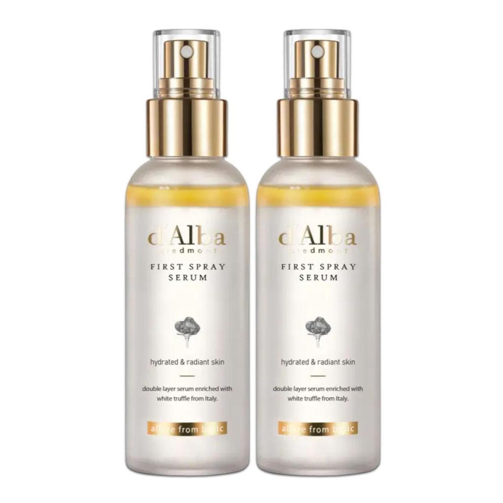 Experience instant hydration and radiance with the d’Alba First Spray Serum Duo Set. This iconic fine-mist serum delivers deep moisture, glow, and skin barrier care in a single spray. Formulated with white truffle extract and nourishing botanical oils, it helps improve skin elasticity while leaving a healthy, dewy finish. The convenient spray type makes it perfect for skincare, makeup prep, and on-the-go hydration. This duo set includes two full-size 100ml bottles for extended daily use.