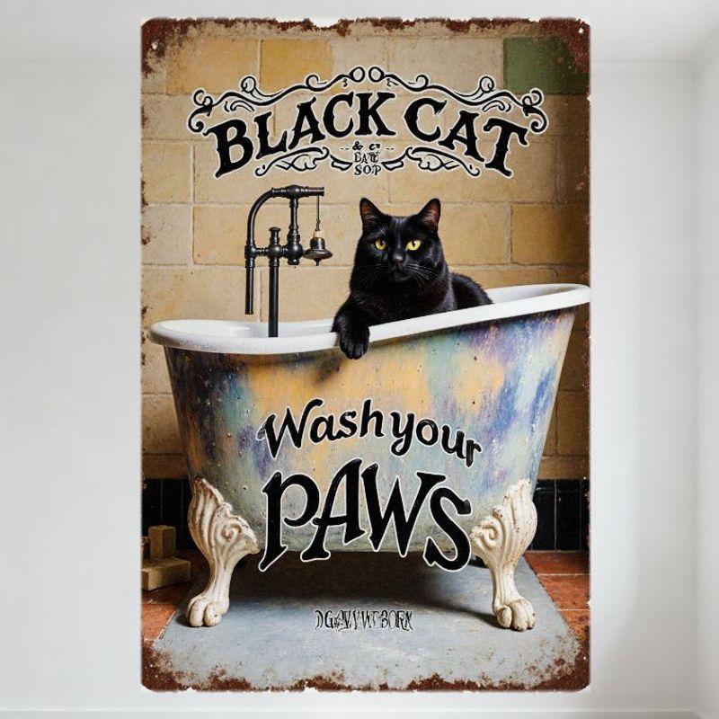 Vintage Black Cat in Bathtub Tin Sign Rustic Bathroom Decor Metal Poster with 'Wash Your PAWS' & 'BLACK CAT & the SOAP' Text for