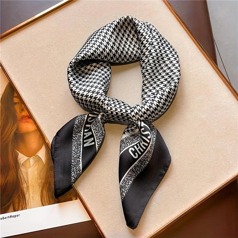 New 70Cm Houndstooth Printed Square Scarf For Women Silk Christian Letters Fashionable And Versatile Headscarf Scarf Bandana