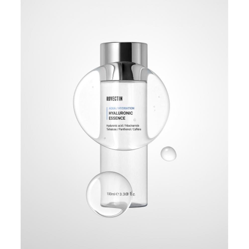ROVECTIN Aqua Hyaluronic Essence 100ml is an essence for all skin types, utilizing a hyaluronic acid-based formula that maximizes hydration and helps maintain moisture deep within the skin. This product is certified for its whitening and anti-wrinkle functionality, aiding in optimizing skin condition.