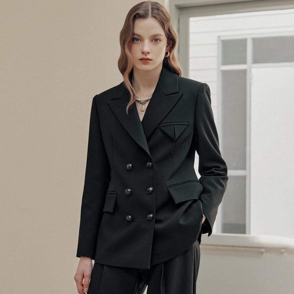 The Majah Classic Double Breasted Tailored Jacket CD03QJ302ON features a classic double-breasted design with standout details. Shoulder pads create an angular silhouette, while the princess line and darts highlight the waistline, providing a formal yet refined look. This tailored jacket showcases meticulous attention to detail with metal buttons, contrasting lining, and slit sleeves.