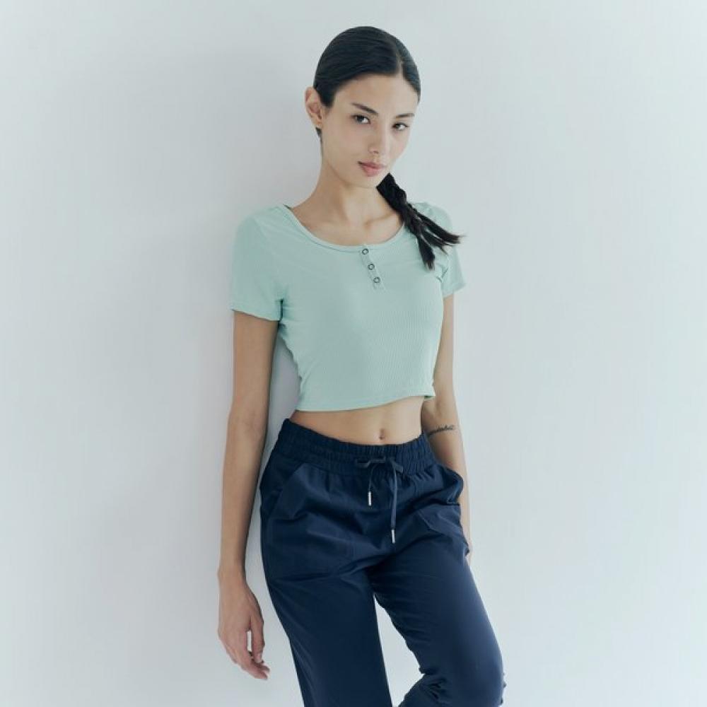 The HUIT8 Ribbed Crop Inbra Short Sleeve T-shirt HTWTS3J18T features a ribbed texture and crop length inbra design, functioning as a bra top. The crop style accentuates the waistline and the inbra structure allows it to be worn as underwear as well.