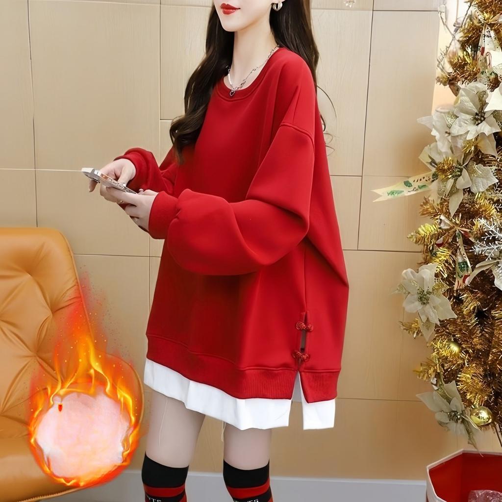 New Style Women's Plus-size Fall/winter Fleece Thick Double-layer Pullover Mid-length Relaxed Style Top