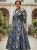 Women's Abstract Leaf Print Maxi V-neck 3/4 Sleeve Belted Waist Elegant Party Dress