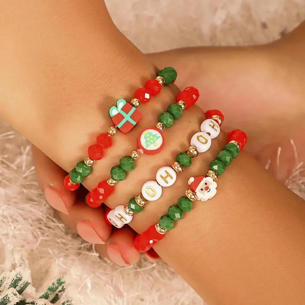 4Pcs Christmas Handmade Strand Beads Chain Bracelets for Women Santa Claus Gift Box Tree Bangles Xmas Holiday Party Jewelry New