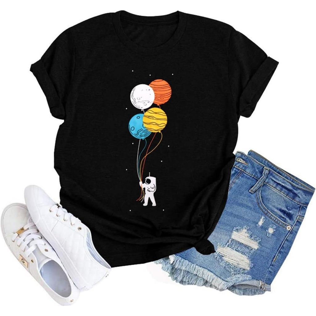 Graphic Shirt Women Cute Astronaut Moon Space Graphic Short Sleeve Tee Top
