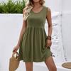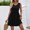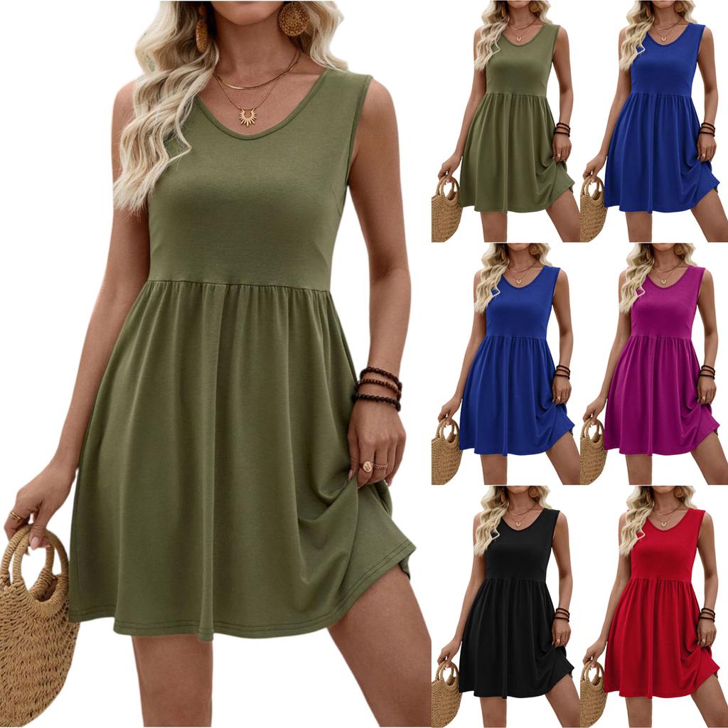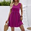Women's Fashionable Color V-neck Sleeveless Vest Dress With Pleated A-line Beach Pocket Dress