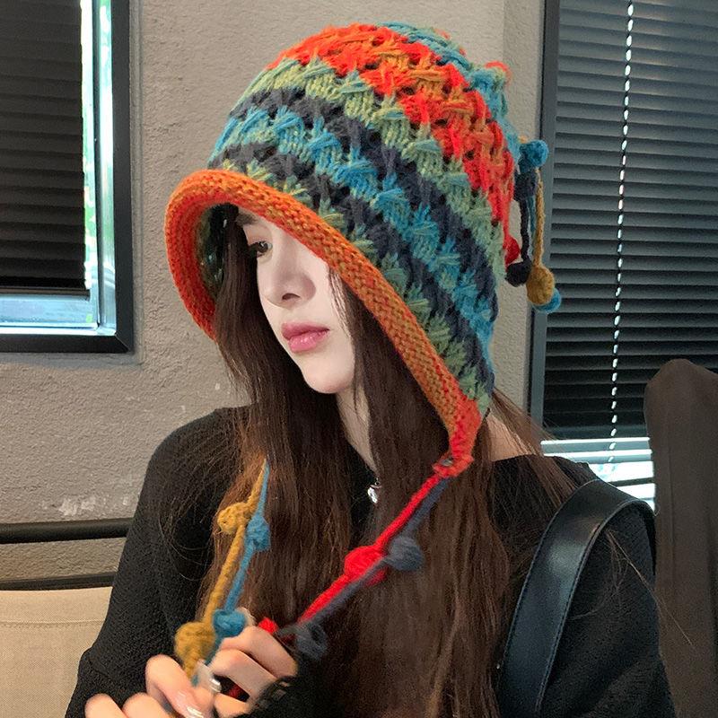 Women'S Baotou Hat Autumn And Winter Colorful Tassel Ball Tie Earmuffs Hollow Knitted Wool Hat