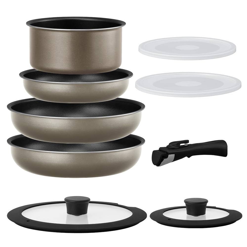 IRIS OHYAMA Frying Pan Set with Diamond Coated Removable Available in 3 Metallic Greige IPDCI-T9S 9-Piece Pans, Induction/Gas Compatible, Handles,