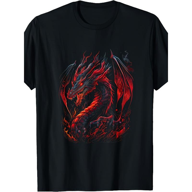 European sizes Men'S Black T-Shirt with Red Dragon Graphic - Plus Size Casual Short Sleeve Round Neck Tee