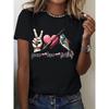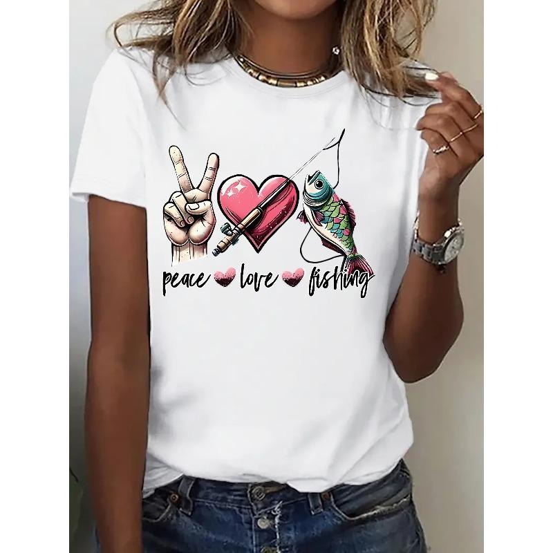 European Size Women's Casual Graphic T-Shirt - Peace Love Fishing Design with Vibrant Fish & Heart Print, Relaxed Fit Round Neck