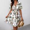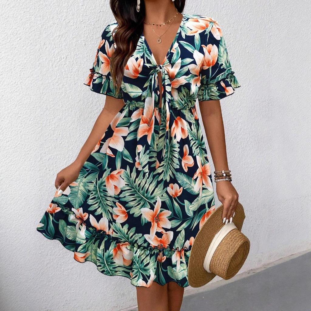 Embrace your summer style with this chic knee-length dress, featuring a flattering V-neckline and a vibrant floral print that captures the essence of both European and American fashion trends. Crafted from high-quality polyester, the dress ensures a lightweight and comfortable fit, perfect for warm days. The use of knitted fabrics adds an additional layer of softness, enhancing its overall appeal and making it an effortless choice for any summer occasion.