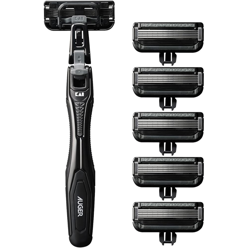 AUGER 5-Blade Razor Combo Pack with Holder and 6 Replacement Blades (Kai Corporation AUGER Razor with Replaceable Blades for Men)