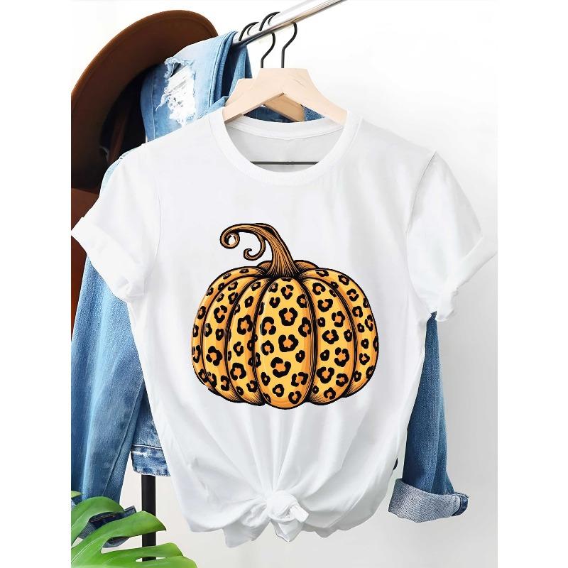 European Size Women's Plus Size White Pure T-Shirt - Oversized Round Neck Short Sleeve with Leopard Print Pumpkin Outline & Black, Soft Breathable