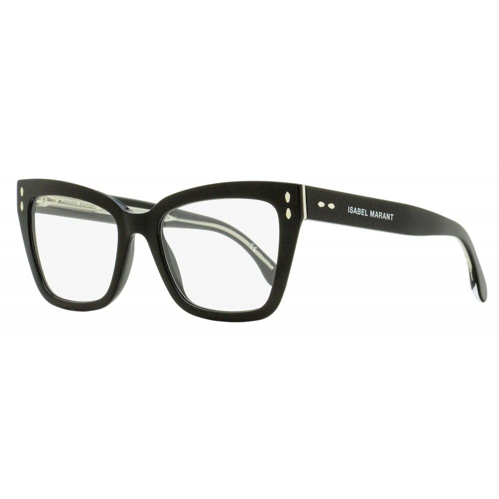 The Isabel Marant 90 Blue Block optical frames feature a square lens shape with a cat-eye profile designed for women. Crafted from acetate, the frames are accented with silver leaf rivets at the front corners and refined metal detailing at the hinges, with branding on the left temple only. Designed for everyday wear, they come fitted with optical-quality protective lenses that reduce blue-light exposure, making them ideal for use with digital devices.