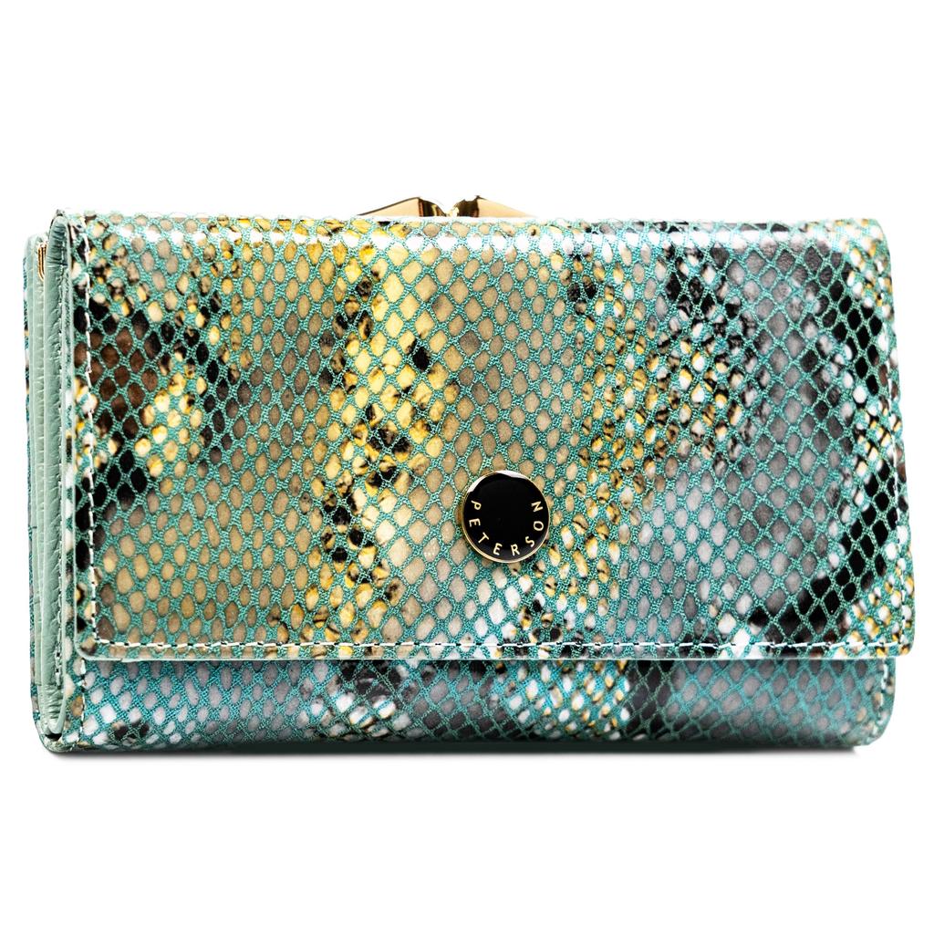Peterson women's purse with RFID hook, elegant wallet Peterson® Women's Leather Wallet:#⃣ A product of a Polish brand trusted by thousands of customers!#⃣ Quality and precision of workmanship | Made of high-quality leather, very pleasant to the touch,#⃣ Unusual design | Its main element is a texture resembling snakeskin, composed using a shiny blue mesh with a background with gray and yellow accents. The wallet has an elegant, shiny look, which gives it a luxurious character. The front features an emblem that further emphasizes the branded character of the product.#⃣ A large number of practical compartments and storage spaces | This model is designed to be extremely intuitive and functional. You can store a significant amount of cards, documents, and cash in it.#⃣ Highest level of security | The wallet is equipped with the STOP RFID system, which protects the card in the wallet from theft.#⃣ Perfect as a gift | The wallet is packaged in a branded hard cardboard box. All you need is a decorative ribbon or bow and the gift for your loved one is ready. Is it time to change your wallet?Would you like to stock up on this essential, fashion accessory and are still wondering which model to choose?Don't hesitate! The presented model is a great solution for you and for someone close to you if you are looking for a practical gift :)We offer the highest quality women's wallet made of natural leather, which: has 1 pocket for coins has 1 pocket for banknotes has as many as 14 card slots is safe - has RFID function holds a registration certificate Parameters Brand: Peterson® Material:Genuine leather Height: 9 cm Width: 14 cm Depth: 3.5 cm Number of coin pockets: 1 Number of banknote pockets: 1 Number of card slots: 14 Number of document slots: 7 Photo slots: 2 Closure: snap fastener, bigiel gift box: yes Wrapped as a giftBy purchasing this wallet, you get an elegantly packaged complete gift that is ready to give to a loved one.With the wallet you always receive: an elegant box (a beautiful decorative branded box visible in the photo) a set of branded labelsPackage dimensions: 10.5 × 17 × 5 cm. Money sectionThe wallet is very roomy. The money pockets are lined with an abrasion-resistant, logo-printed lining. You can store your coins in 1⃣ external pocket that closes with a clasp. It is really spacious, you can easily take out coins from it. There is 1 open compartment for banknotes Highest level of securityWallet equipped with a special lining with RFID BLOCKING SYSTEM (Radio-Frequency IDentification), which protects proximity cards, biometric documents, ID cards and public transport cards against unauthorized data reading. The technology prevents data from being read using special readers used for data theft.RFID anti-theft protection for the following documents: Biometric passports All contactless payment cards such as Paypass, Paywave, Wave and Blink New student ID cards Public transport cards Building access cards operating on a 13.56 MHz frequency MIFARE, HID iClass, DESFire cards Peterson® - trust a renowned brand!Peterson® brand products are extremely popular. Each product is designed in line with current trends, reflecting an original and timeless style. The richness of colors and patterns, as well as high quality of workmanship, are the features that characterize the brand.Feel fashionable and comfortable in every situation, complement your wardrobe with fantastic accessories at very affordable prices!
