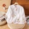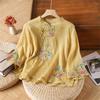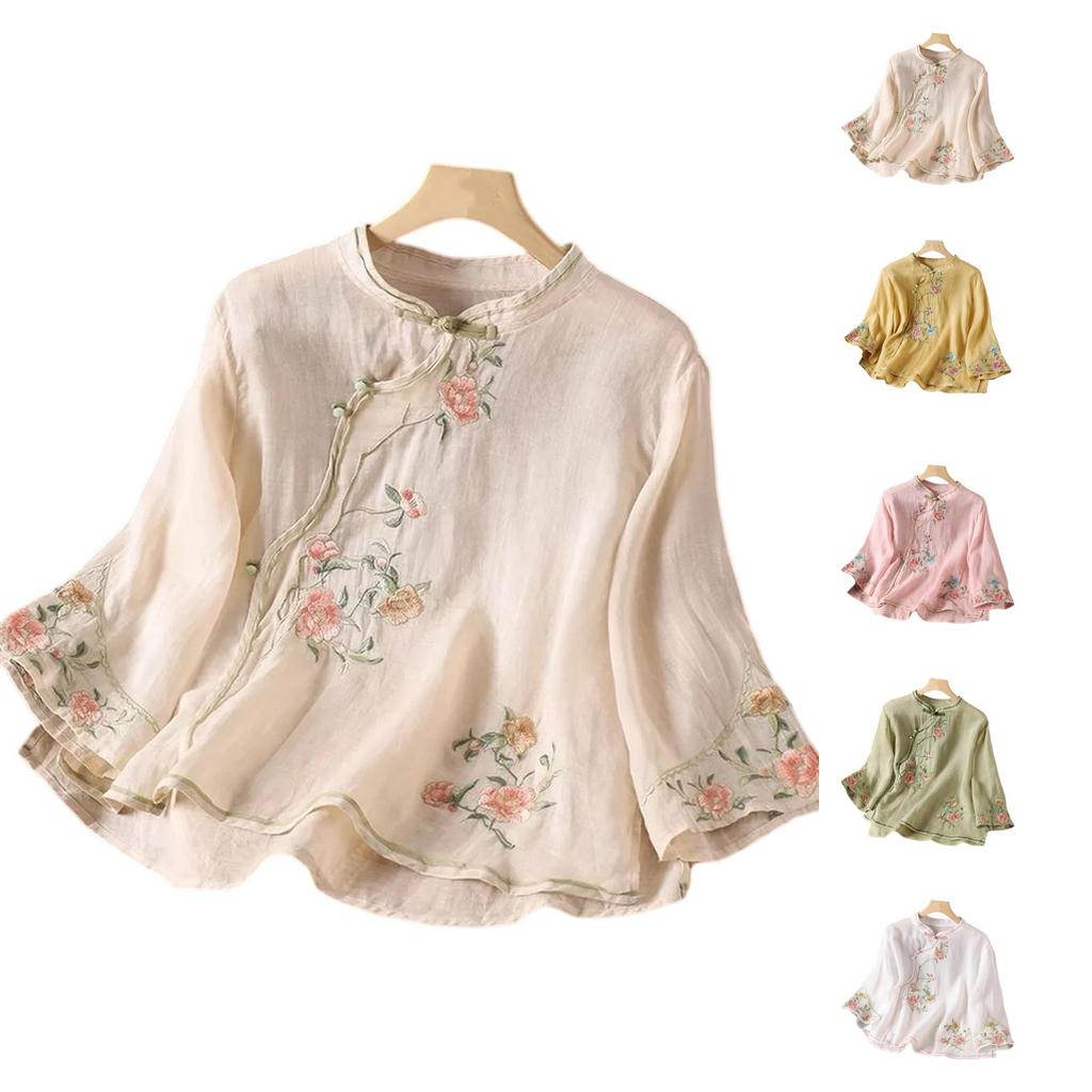 Women's Vintage Inspired Loose Fit Embroidered Mandarin Collar Button Front Cotton Linen Blend Blouse With Three Quarter Sleeves